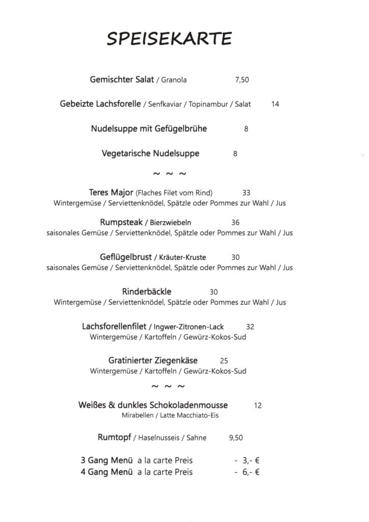 Startseite Restaurant Wochenmenü Speisekarte Terrasse & Hofgarten Veranstaltungen Gastgeber Lieferanten Gästezimmer Ferienwohnung Aktuelles Kontakt Impressum Datenschutz Stellenanzeigen Öffnungszeiten & Reservierung Startseite Restaurant Wochenmenü Speisekarte Terrasse & Hofgarten Veranstaltungen Gastgeber Lieferanten Gästezimmer Ferienwohnung Aktuelles Kontakt Impressum Datenschutz Stellenanzeigen Öffnungszeiten & Reservierung Speisekarte Dies ist nur eine Musterkarte –die Speisekarte wechselt je nach Verfügbarkeit und Jahreszeiten. – Änderungen vorbehalten – KINDERKARTE