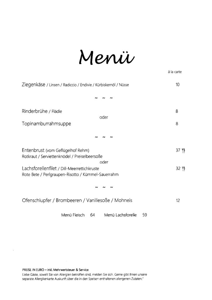 Startseite Restaurant Wochenmenü Speisekarte Sonntagskarte Weihnachten Terrasse Hofgarten Veranstaltungen Gastgeber Lieferanten Gästezimmer Ferienwohnung Aktuelles Kontakt Impressum Datenschutz Stellenanzeigen Öffnungszeiten & Reservierung Menü Startseite Restaurant Wochenmenü Speisekarte Sonntagskarte Weihnachten Terrasse Hofgarten Veranstaltungen Gastgeber Lieferanten Gästezimmer Ferienwohnung Aktuelles Kontakt Impressum Datenschutz Stellenanzeigen Öffnungszeiten & Reservierung Wochenmenü Dies ist nur eine Musterkarte – das Menü wechselt je nach Verfügbarkeit und Jahreszeiten. Wir bieten nicht immer ein Menü an – die Gänge dürfen Sie auch einzeln auswählen.– Änderungen vorbehalten –